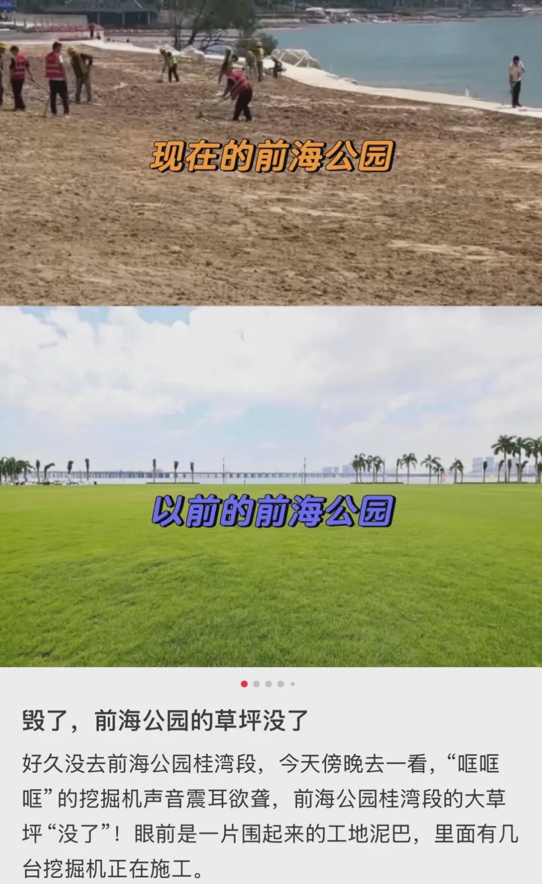 不少市民发帖称,南山区前海石公园桂湾段大片草坪已被铲除,此前开阔的草坪常常举办展览、音乐会等活动,不少人曾在此露营聚餐、观赏夕阳,如今部分区域被围挡围住,成为泥巴地,且仍有挖掘机在施工。