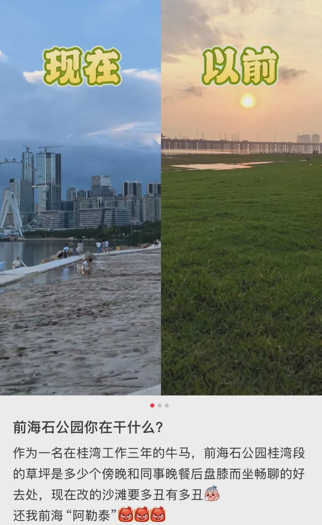 近日,社交平台上有市民反映南山区前海石公园桂湾段曾经的大片草坪被铲除,变成人工沙滩,而沙子颗粒粗糙、颜色深,游玩体验感欠佳。