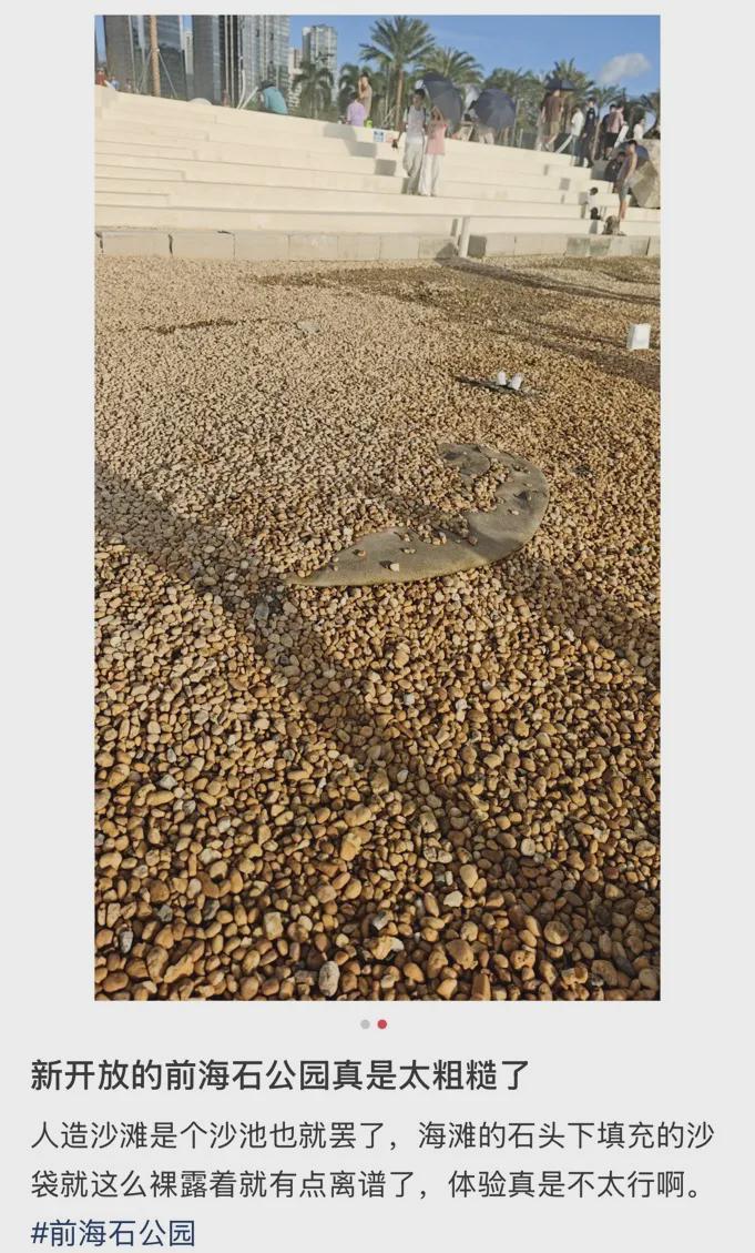 近日,前海石公园桂湾段滨海岸线海堤及景观提升工程基本完工,深圳首个都市沙滩——前海沙滩也正式开放,部分市民已“抢鲜”前往该公园体验游玩。然而,这片备受关注的沙滩完工后,部分市民却称“体验感欠佳”。