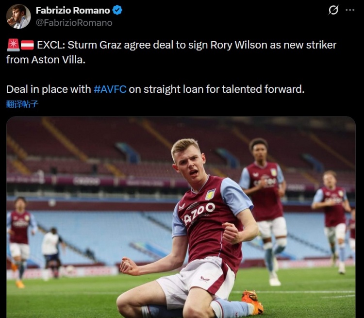 罗马诺写道:“独家消息:格拉茨风暴已就签下阿斯顿维拉前锋罗里·威尔逊达成协议。”